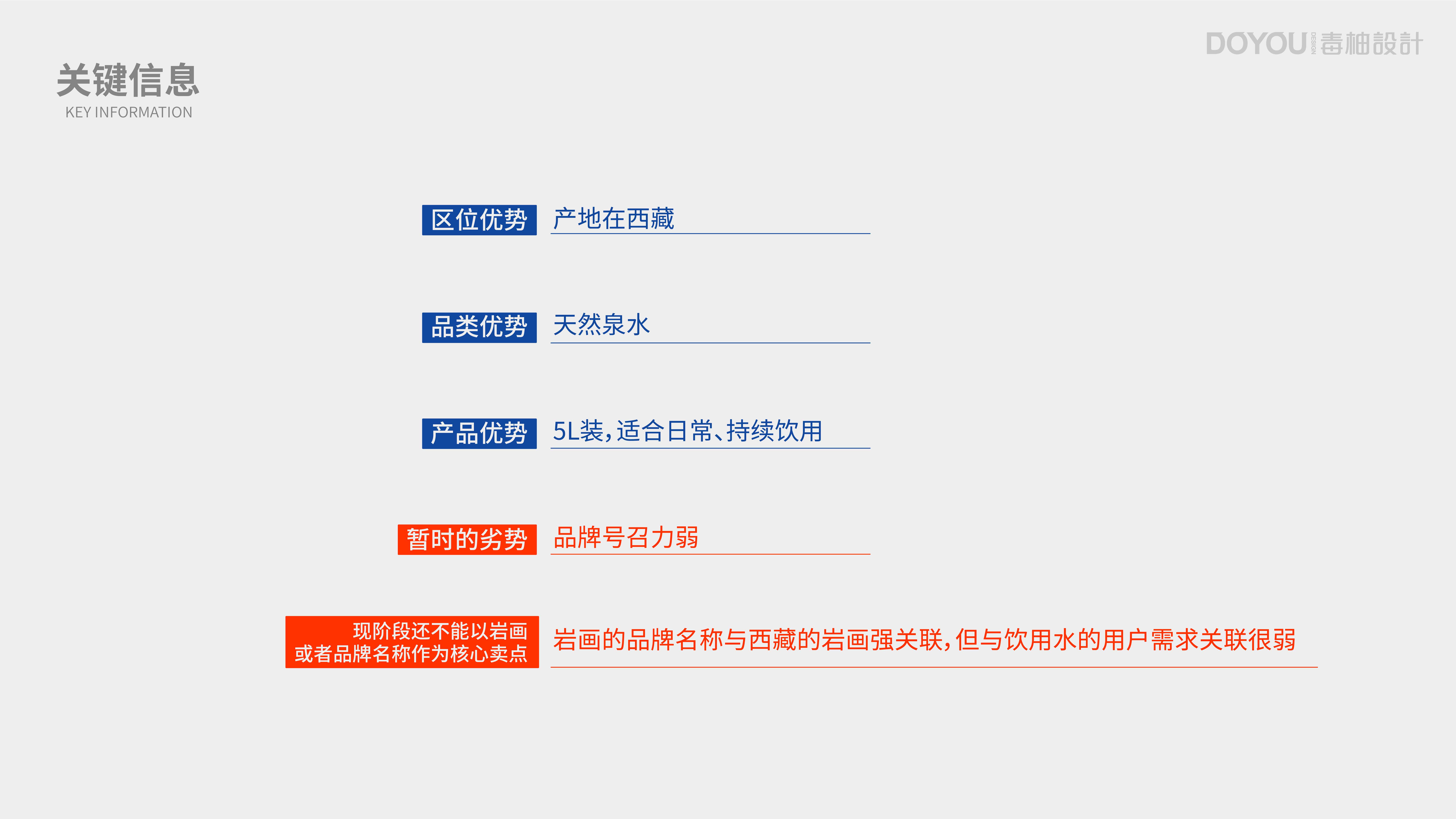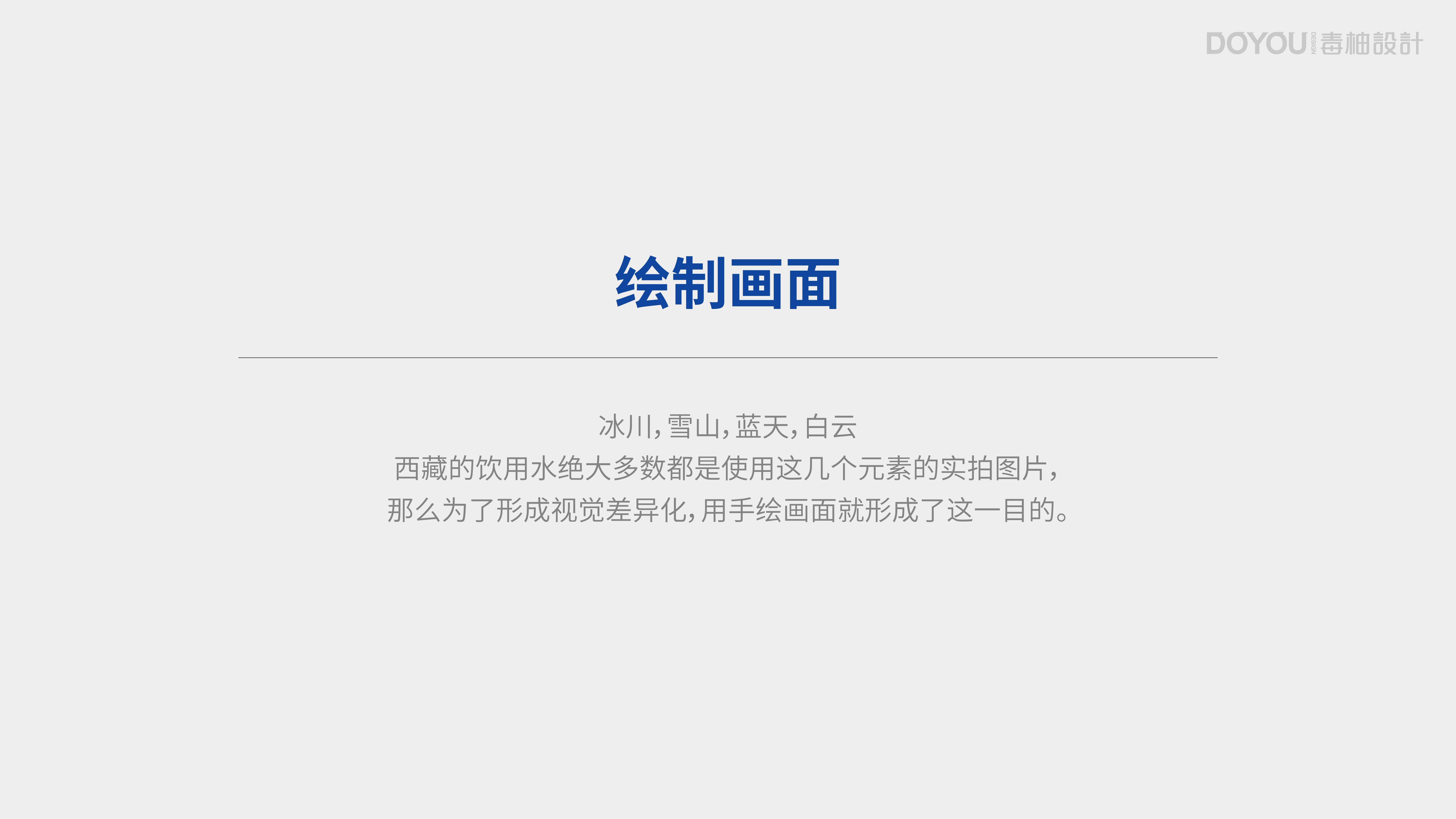 当提到西藏,很多人想到的关键词都会是神圣、纯净、污染少之类的词汇来形容。所以西藏地区给大家带来的印象是大体趋同的,并且通常这个印象是褒奖多于贬抑。在分析了产品的关键信息之后,我们决定要运用大家对西藏的印象共同点,凸显产品区位优势,让天然水的品类进行细分,占据“西藏天然水”的细分市场。