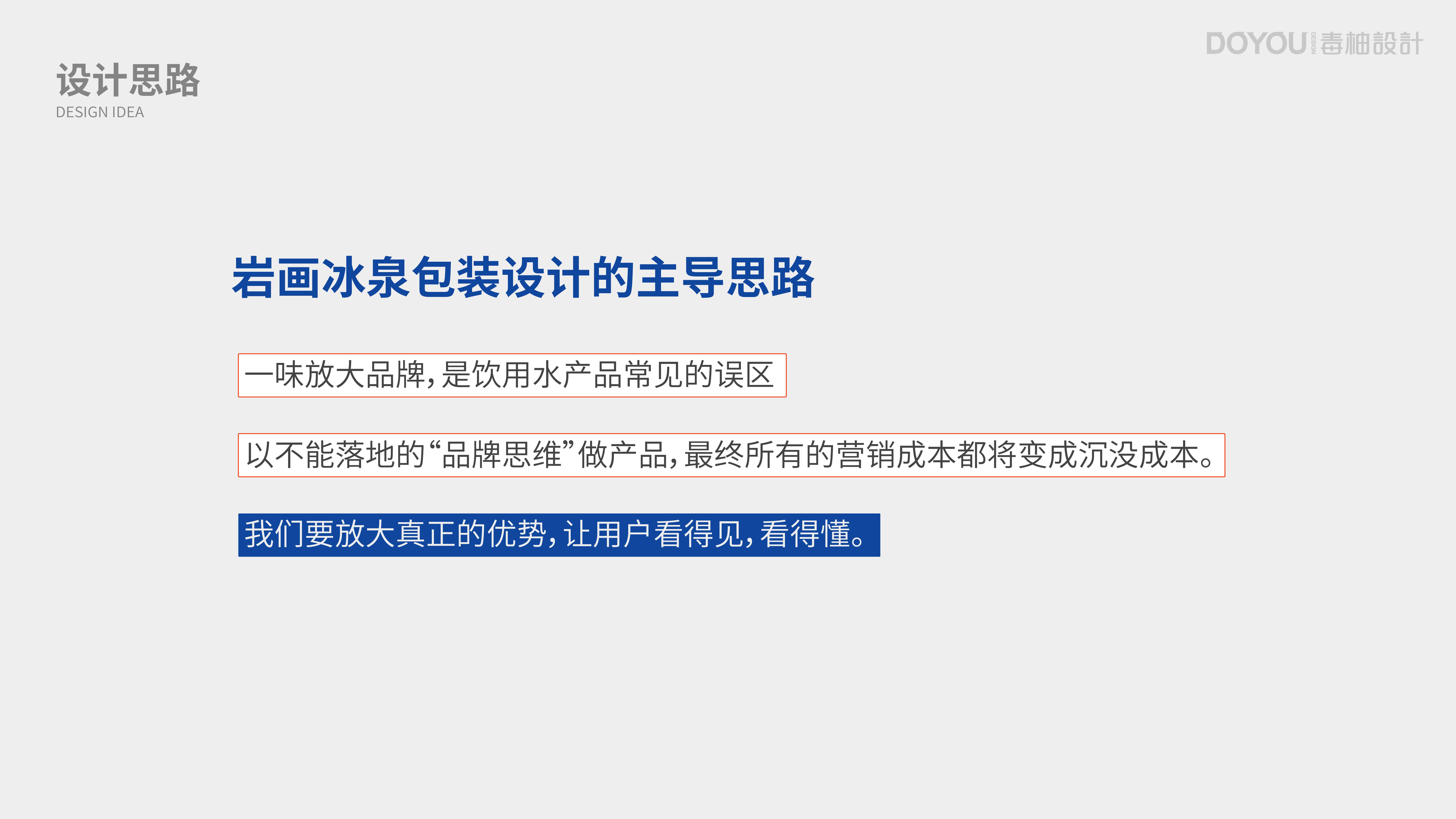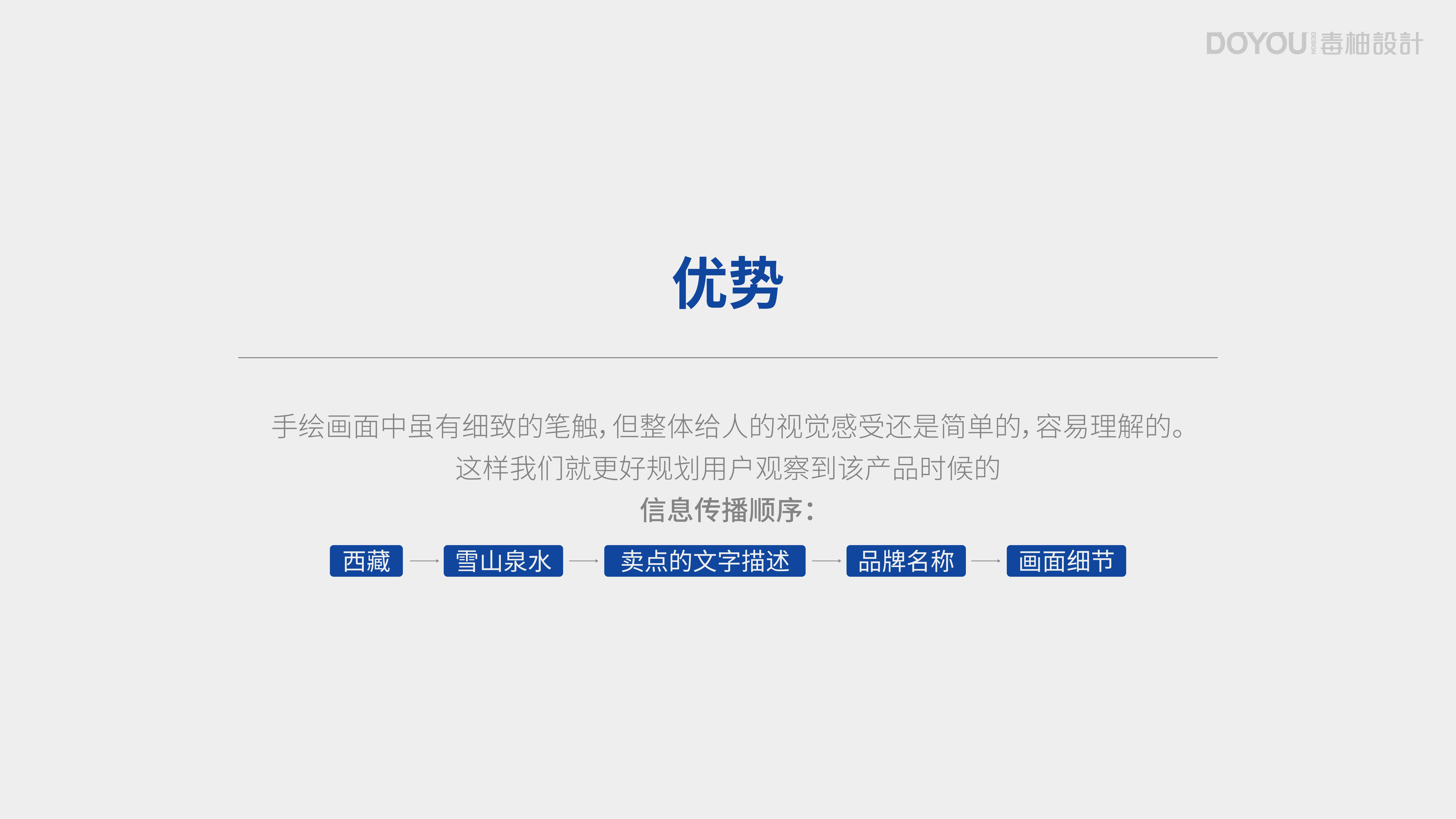 介于市面上西藏的饮用水有很多都使用了当地的实拍照片作为包装的背景图案,为了形成差异化采用手绘西藏雪山的图像,用显著的文字来体现“西藏雪山泉水”这一品类信息。产品计划是先在西藏的阿里地区销售,积累品牌资产,将来在合适的时机岩画冰泉会供其他省份销售。由于目前此款天然水还是针对西藏阿里地区,所以在包装上还体现了在当地人心中容易引起共鸣的其他信息:格萨尔王的故事和阿里地区的岩画。这样既引发共鸣,也能让“岩画冰泉”这个品牌名称跟天然水产品本身建立关联。